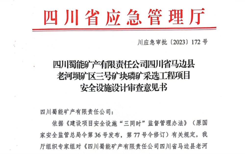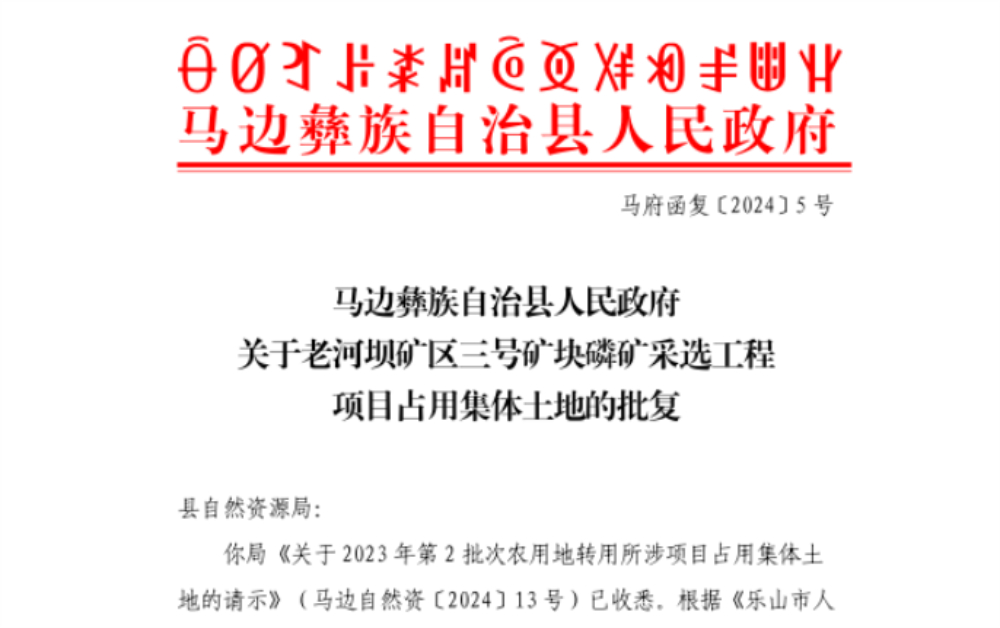 2024年1月18日,三號(hào)礦山項(xiàng)目用地農(nóng)轉(zhuǎn)用申請(qǐng)取得馬邊縣政府批復(fù),成為省內(nèi)該批次首個(gè)完成農(nóng)轉(zhuǎn)用審批的項(xiàng)目。