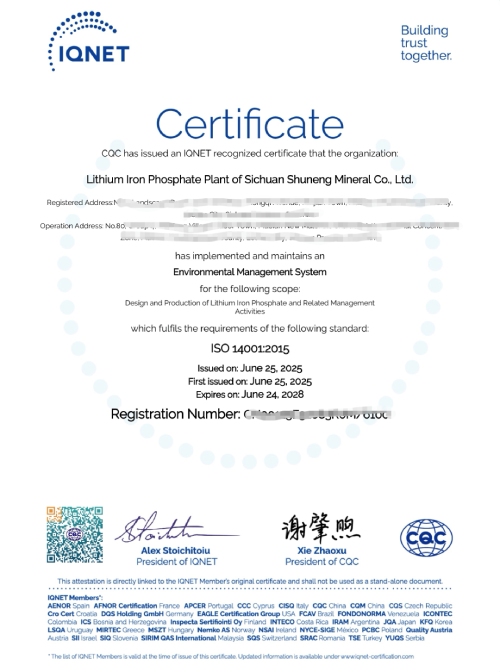 2025年6月25日,磷酸鐵鋰廠成功通過(guò)ISO14001環(huán)境管理體系認(rèn)證。
