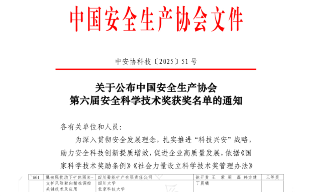 2025年12月19日,公司與四川大學(xué)、北京科技大學(xué)合作的科研項(xiàng)目《爆破強(qiáng)擾動(dòng)下礦體圍巖—支護(hù)風(fēng)險(xiǎn)靶向精準(zhǔn)調(diào)控關(guān)鍵技術(shù)及應(yīng)用》獲得中國(guó)安全生產(chǎn)協(xié)會(huì)第六屆安全科學(xué)技術(shù)進(jìn)步獎(jiǎng)三等獎(jiǎng)。